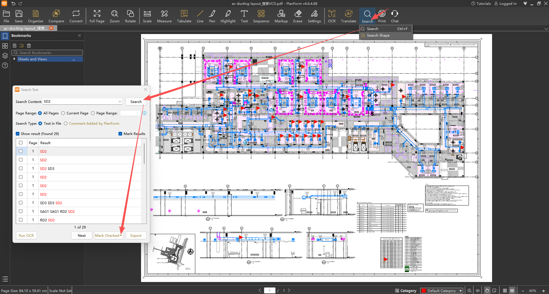 Use the "Search Shape" function.Select the name of a component or fixture. The AI text recognition engine will automatically find all matching targets. Click any result to instantly highlight and locate it on the drawing, ensuring accurate verification.