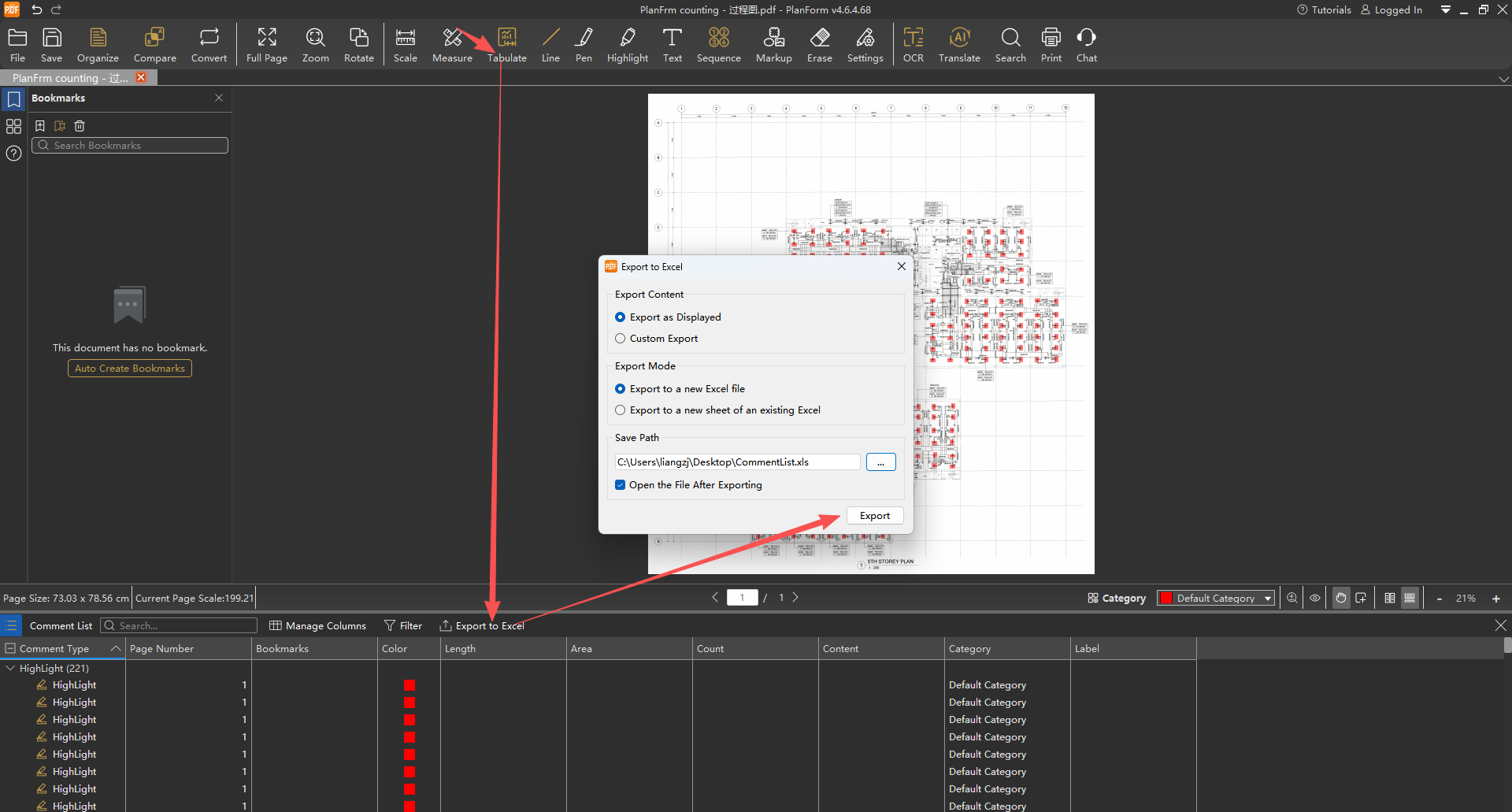 All your counted items are automatically compiled into a clear Comment List, organized by drawing page, bookmark, or color. Click any entry in the list or any mark on the drawing for synchronized highlighting, making review effortless. The Comment List can be exported to Excel with one click.