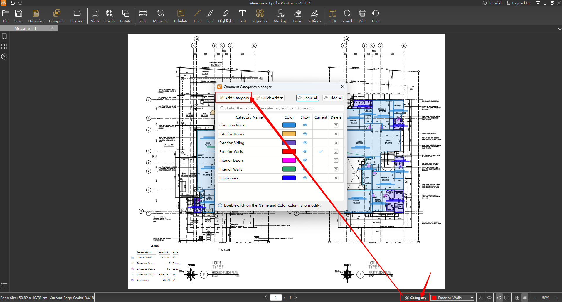 Establish clear categories based on quantity types (e.g., Exterior Doors, Interior Doors,Exterior Walls). Assign a distinct color to each category for easy differentiation of measurement items later.