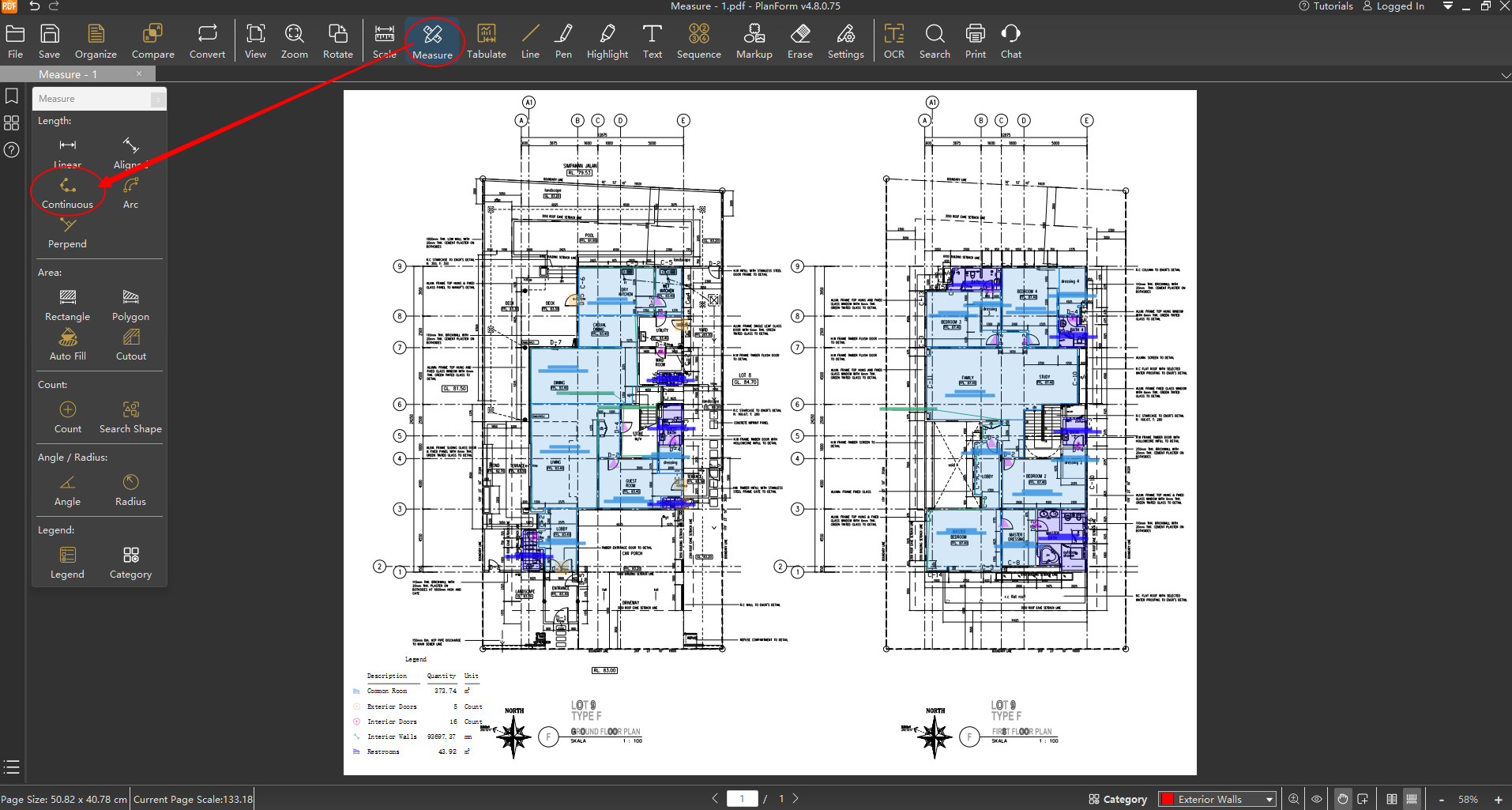 First,use "Continuous" function to measure the length of exterior walls. Similarly, measure the lengths of interior walls.