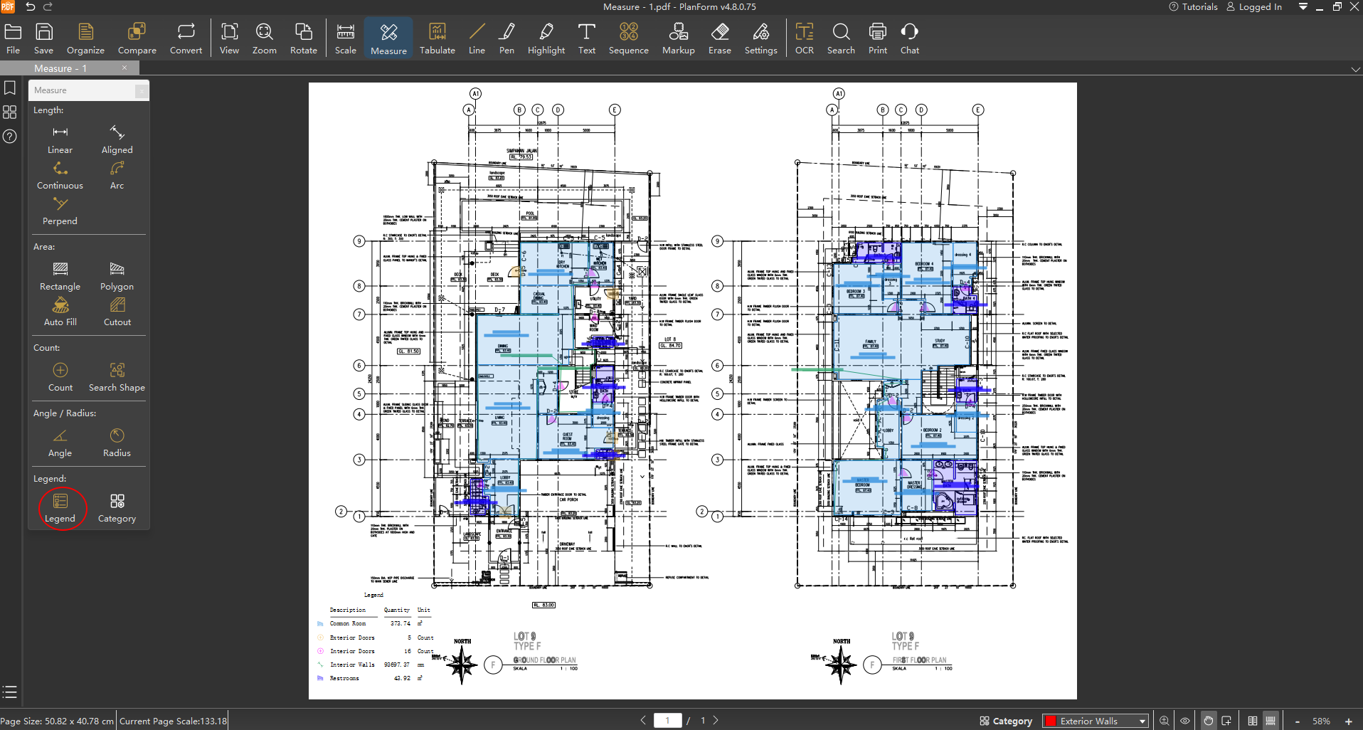 A legend displays all your measurement types in a clear, graphic table—making your measurement results instantly understandable. This intuitive quantity takeoff tool lets estimators, contractors, and engineers see unit totals and costs directly on the drawings. With PlanForm, generating a legend is very simple. In just three steps, you can complete your takeoff and have a professional legend.