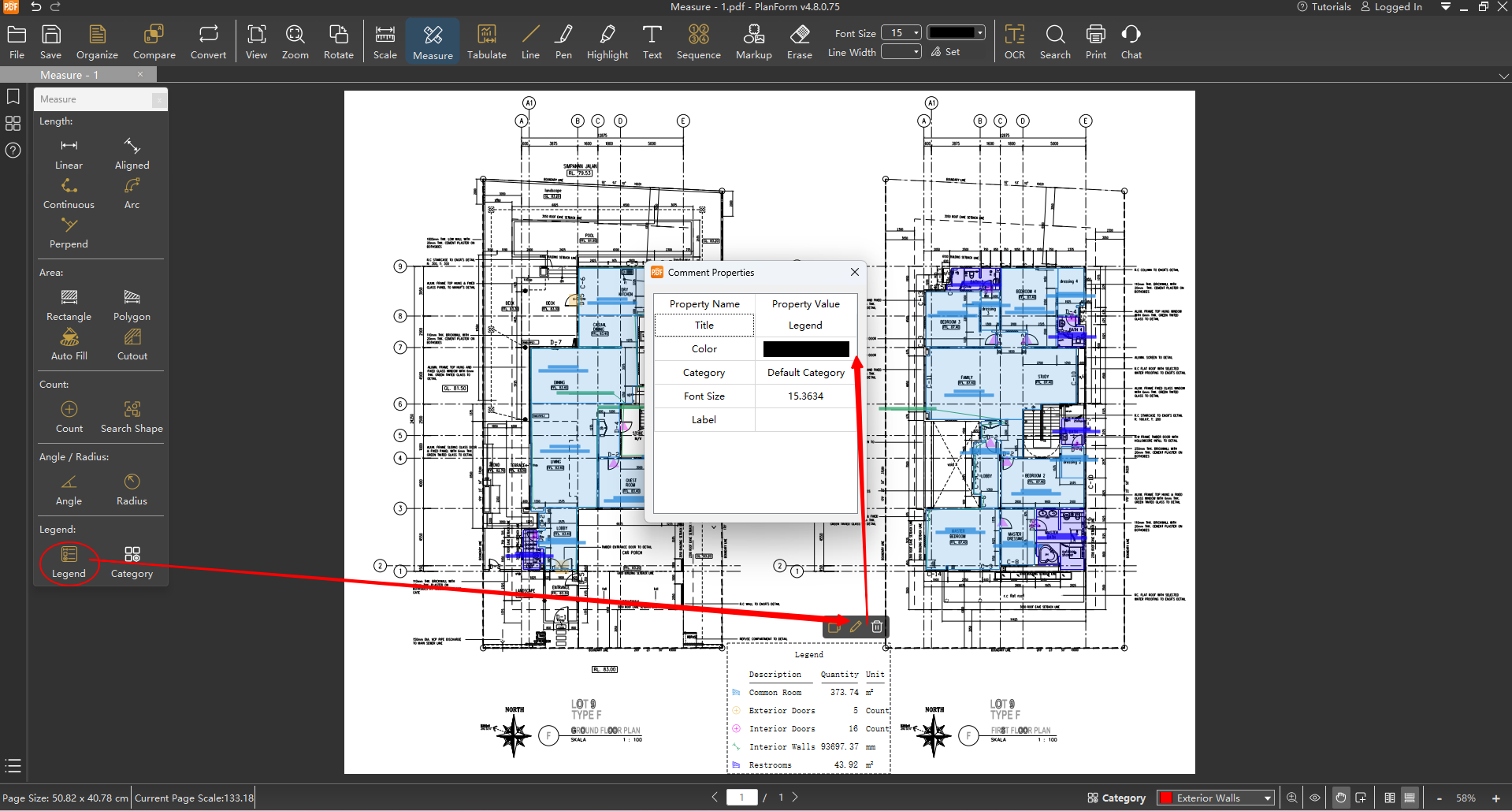 Click the "Legend" function and place the dynamic legend in a suitable location on the drawing. The legend will automatically display the page's statistical results using: Item Icons in presetted Colors, Description, Total Quantities, and Units. You can resize the legend by dragging. Even more powerful: you can freely modify the legend's title and text color to make reports meet your requirements. Most importantly, the legend updates in real-time with any measurement change!