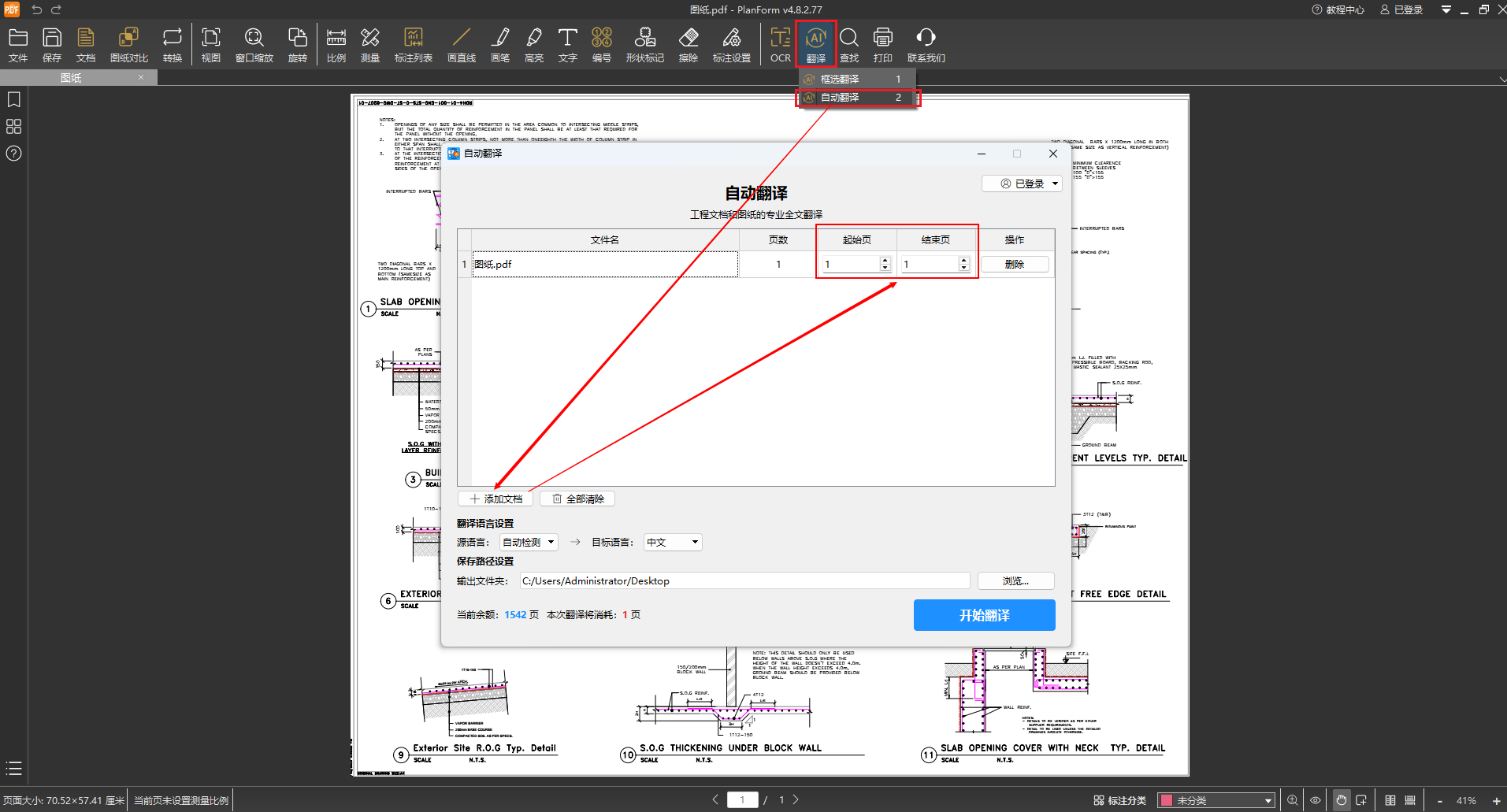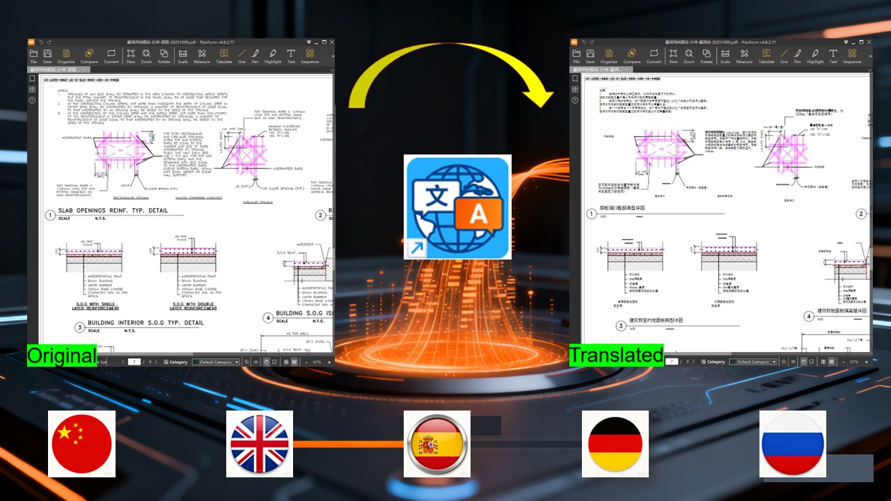 PlanForm的「自动翻译」功能,正是为应对这些挑战而生的专业解决方案。我们拿日语和泰语的图纸为例,看看它的效果。操作极其简便:打开软件,将需要翻译的PDF图纸或技术文档选择上,整个过程在您的本地计算机上完成,无需上传任何敏感数据,从根本上保障了项目信息的安全。