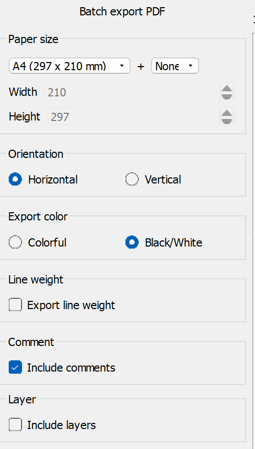 Adjust paper size, orientation, color settings, line weights, and layer/comment inclusion.