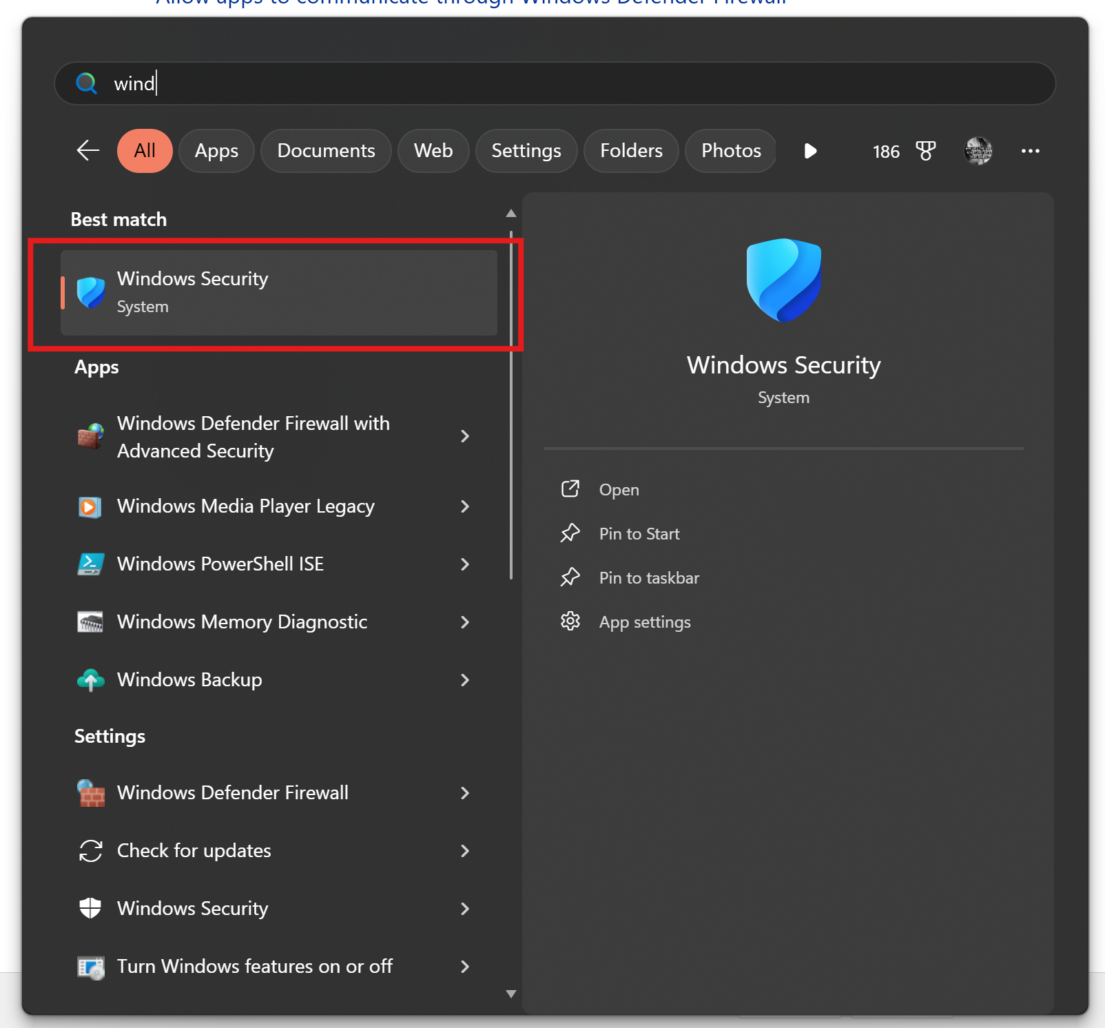 Press Start → type Windows Security → open it.
