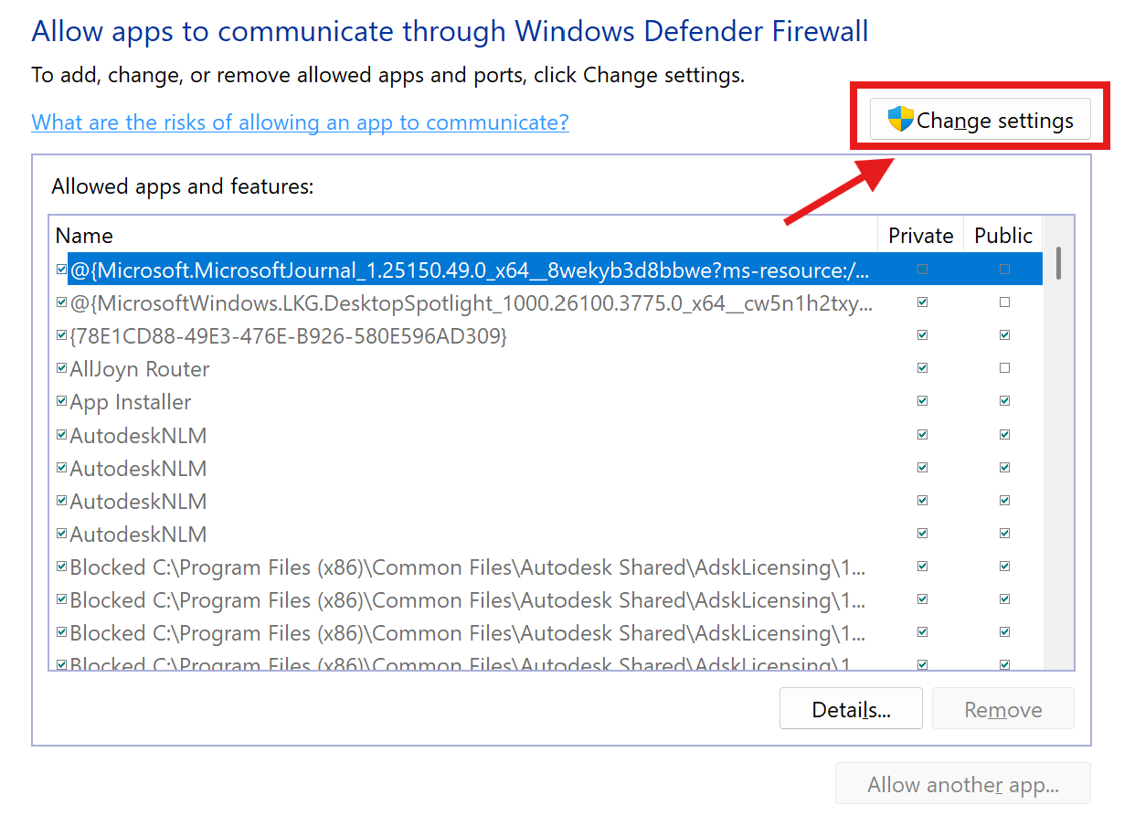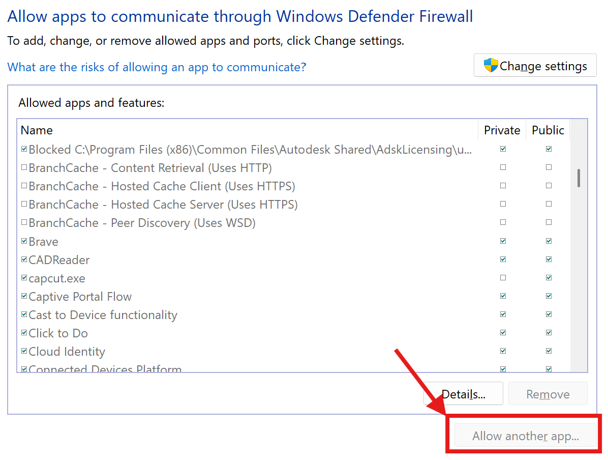 If it’s not listed, click Allow another app… and browse for the executable file.