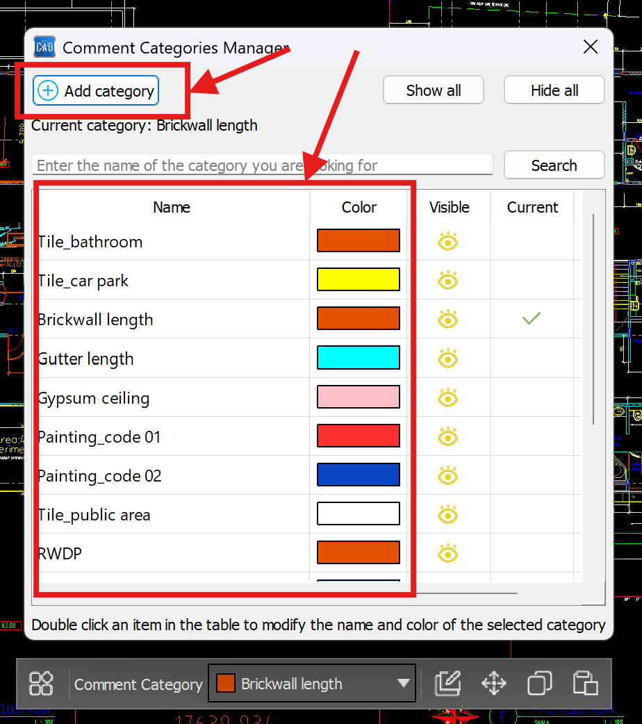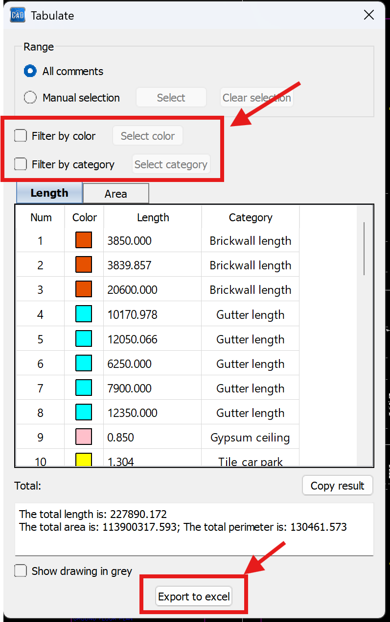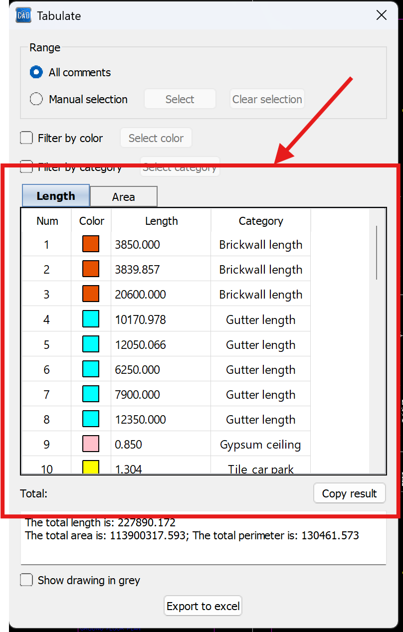 CAD Reader addresses this pain point by introducing it’s most unique feature comment category and tabulation which allow user to taking off easily without the needs to manually transfer all measured data. All measurements taken from the drawing, whether it's length, area, or unit quantity, are automatically organized and can be exported directly to Excel, streamlining the workflow and saving valuable time.